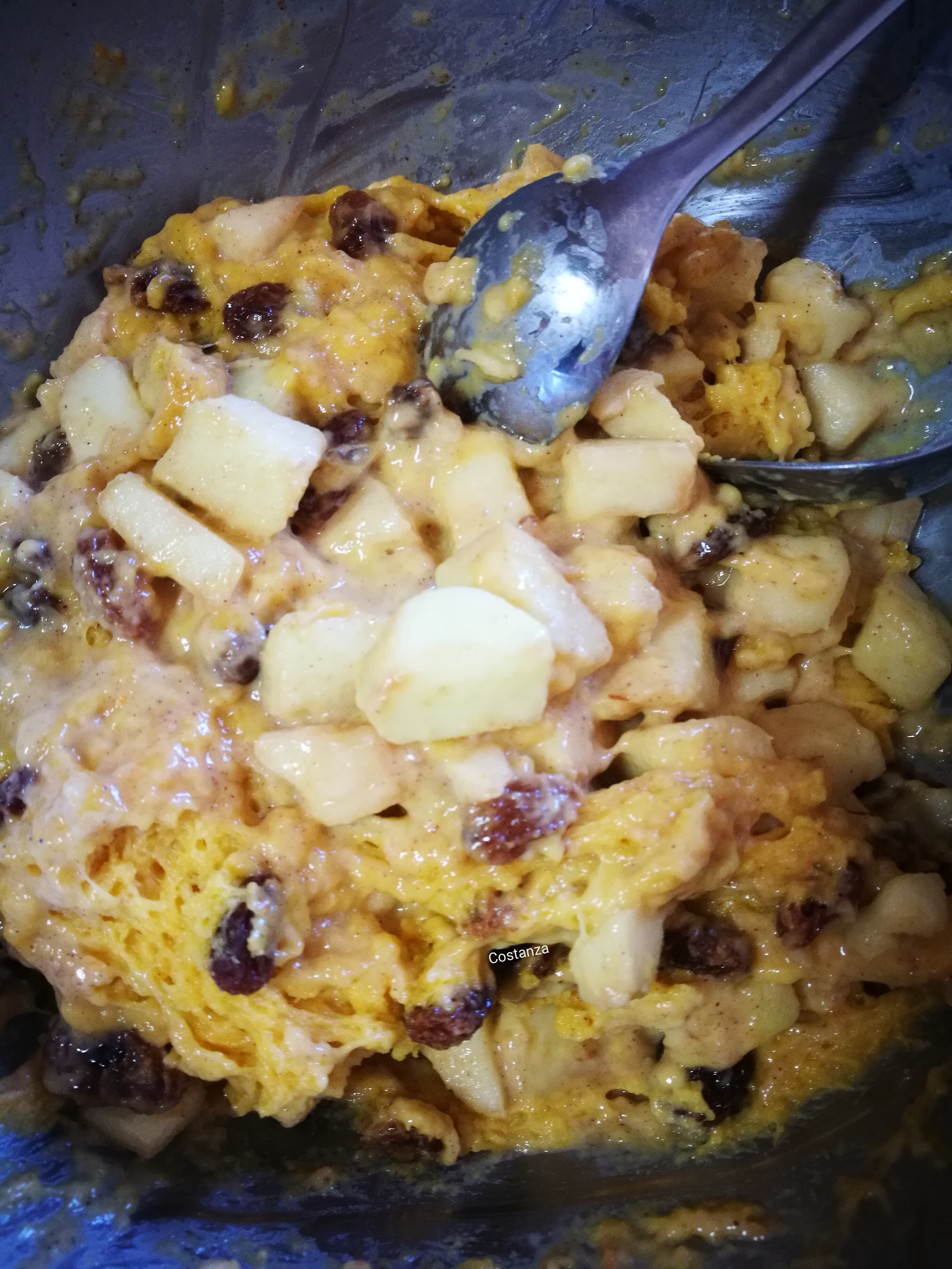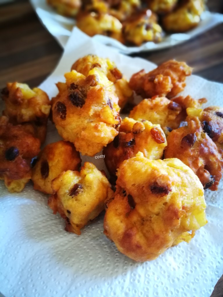 Per prima cosa, sbucciare la mela e tagliarla a pezzetti. Condire con il liquore scelto, un cucchiaio di zucchero e una spolverata di cannella. Mettere da parte e preparare l’impasto. In una ciotola, rompere le uova e aggiungere latte, olio, mezza bustina di lievito e iniziare a sbattere con una forchetta aggiungendo farina un po’ per volta. Quando l’impasto è pronto, bello omogeneo, lasciarlo riposare per una ventina di minuti. Trascorso il tempo, aggiungere la mela e l’uvetta ben strizzata.