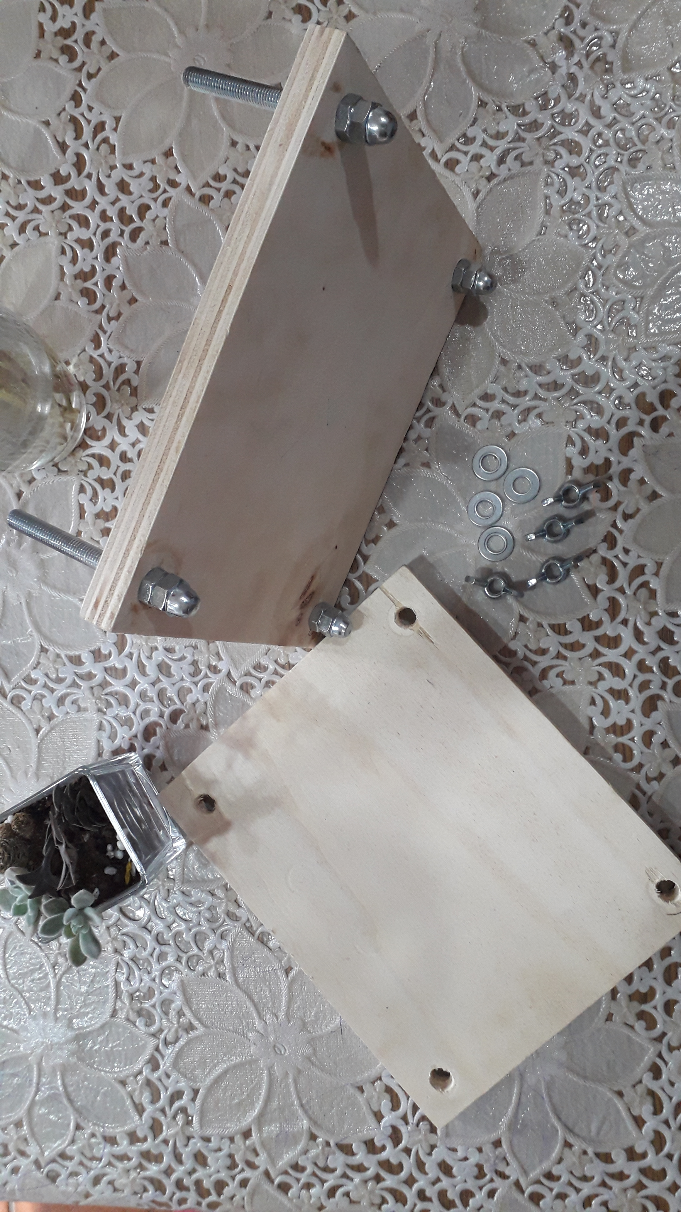 Tagliare le tavole e successivamente fare 4 buchi sugli angoli a 4/5 cm dai bordi. Inserire le bacchette di ferro ( filettate) in una delle due tavole per poter fare la base. Bloccate i dadi nella parte inferiore. Inserite la seconda tavola nelle bacchette e avvitate le farfalline. Infine occorre inserire del cartone ( anche quello da pacchi andrà bene ) e della carta assorbente tra una tavola e l’altra al fine di poter essiccare per bene i fiori