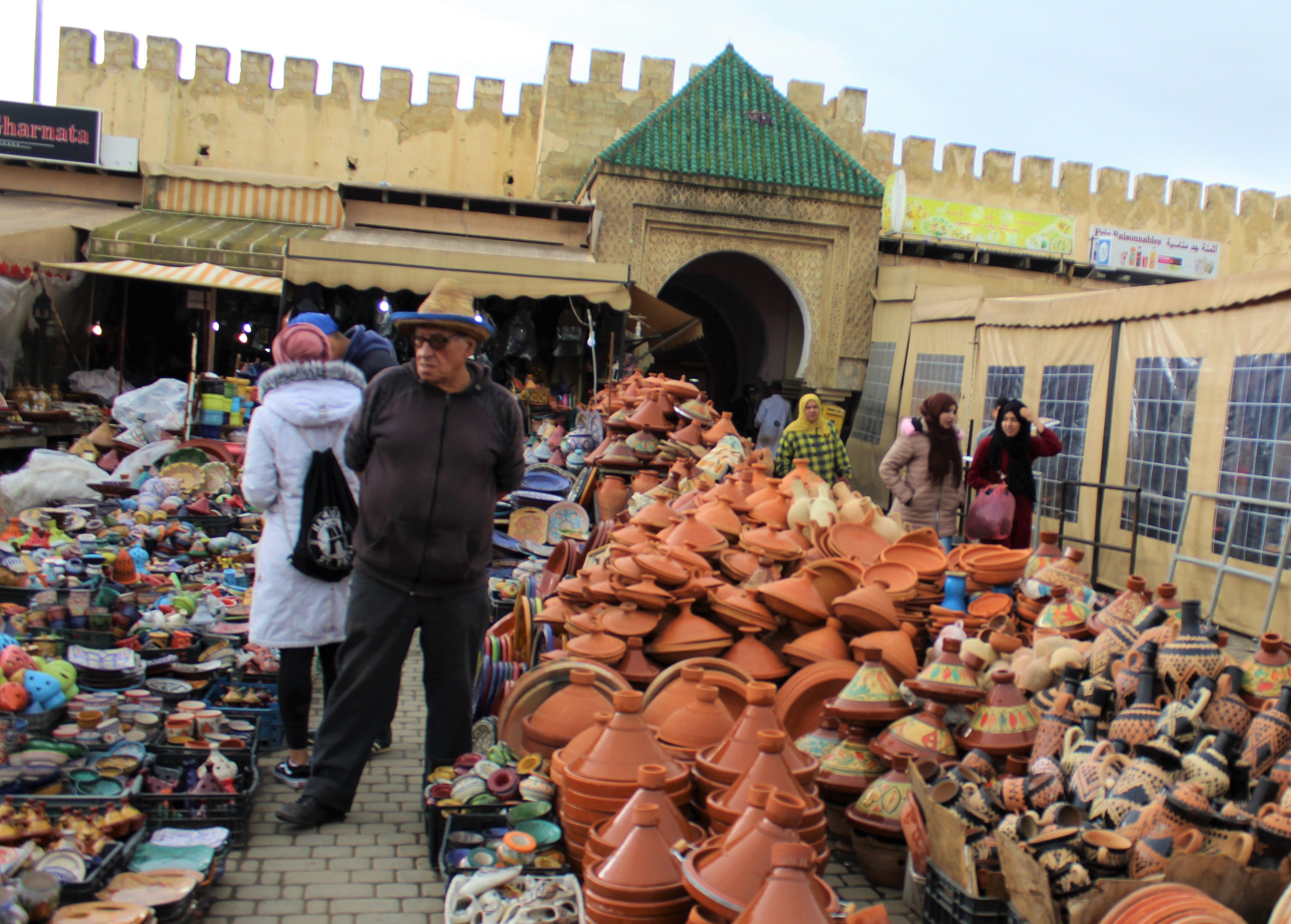 Il tempo non è dalla nostra parte; la pioggia ci accompagna durante quasi tutto il viaggio ma fortunatamente ci da un po’ di tregua mentre passeggiamo, o meglio, ci divincoliamo in mezzo a banchi di frutta e verdura, oggettistica varia e souvenir, e tantissima gente, tra cui qualche turista. Il pranzo lo facciamo sotto un tendone e, mentre la pioggerellina cade sulle colorate ceramiche che avevamo di fronte, io e Sandra ci gustiamo i due più famosi piatti del Marocco: il cous cous e la tajine. Anche questi una delizia!