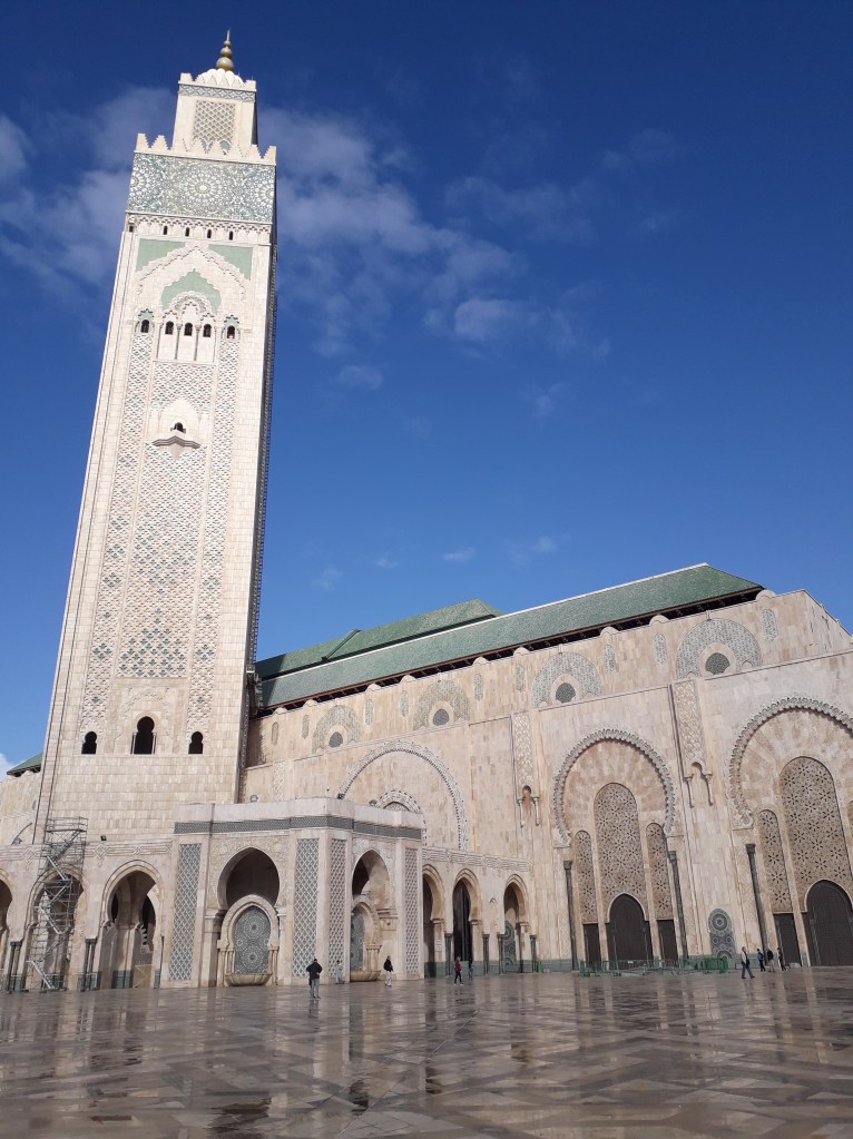 Andiamo a cercare gli altri e li troviamo seduti di fronte ad un camioncino che frigge pesce; soddisfatti della loro scorpacciata, pagata pochissimo, si uniscono a noi. E tutti ci uniamo alla prima guida improvvisata che ci aiuterà a trovare l’hotel in cambio di una visita nel suo negozio di creme, spezie e souvenir, dove tutto costa il doppio. Ovviamente le mie amiche, poco esperte e ignare della strategia di “attracco al turista” fanno acquisti ed decidono da farsi la manicure. Io e Giovanni invece, i maschi del gruppo, andiamo in giro per le bancarelle. Ceniamo vicino l’hotel, l’unico in stile moderno che ho prenotato, e diamo un’occhiata alla mappa della città per evitare di perderci nuovamente e raggiungere subito la Moschea di Hassan II la mattina dopo. È per dimensioni la moschea più grande del Marocco ed è la struttura religiosa più alta del mondo.