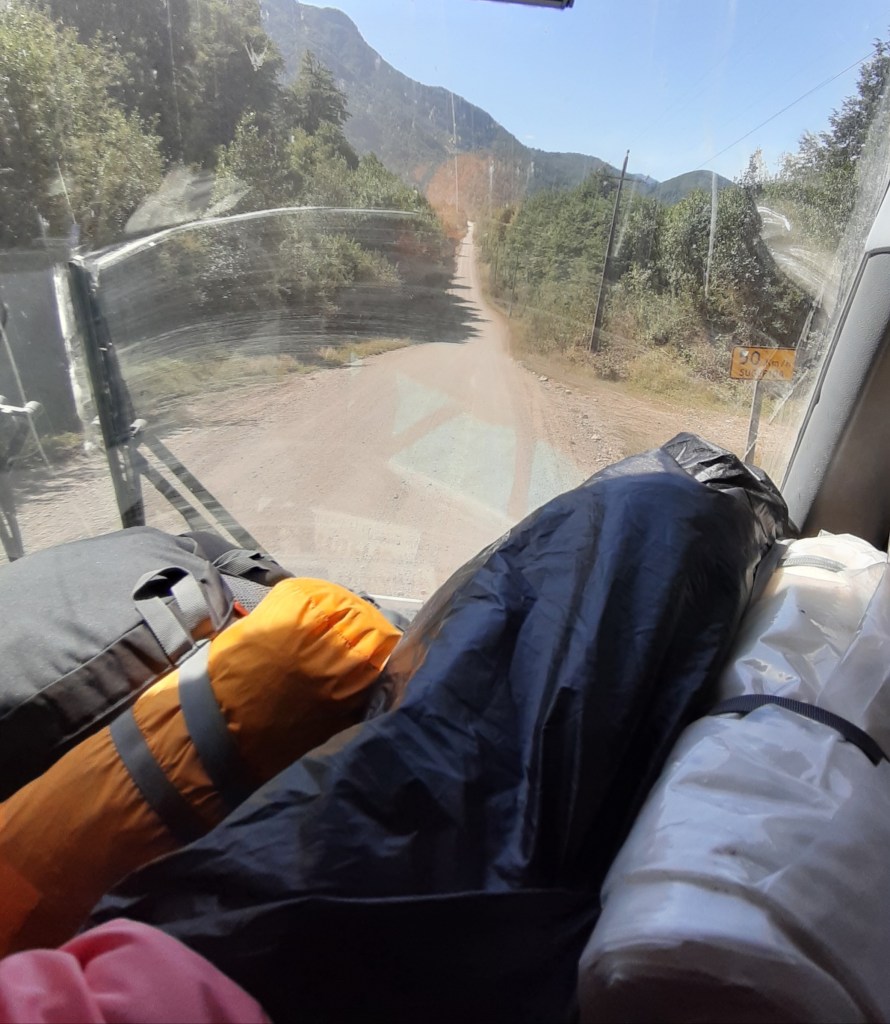 Optiamo per arrivare alla prossima cittadina per poi proseguire via autostop. Scendiamo e ci ritroviamo in mezzo al nulla! Passano pochissime macchine e la situazione sembra essere complicata. Ma ecco arrivare un bus a tutta velocità ed è lo stesso partito pieno da Chaiten. Ha cambiato solo il colore, passando dal blu al marroncino! Miracolosamente si ferma; l’autista si intasca il denaro e noi facciamo un viaggio di tre ore in piedi, ma va benissimo!