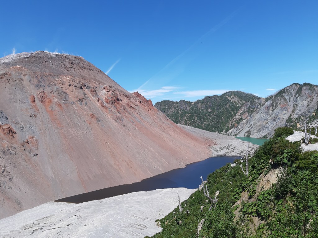 Siamo in cima. Il vulcano sembra essere coperto da una sabbia color rosa salmone che arriva a picco su una laguna di un blu immenso. Di lato ce n’è un’altra turchese su cui si affaccia una parete rocciosa. È un paesaggio mozzafiato!